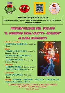 Mercoledì 24 luglio, alle ore 21.30, l’Associazione NaJemi presenterà il volume di Ilina Sancineti “Il cammino degli eletti- Decimus”, Mongolfiera Editrice. La presentazione si terrà presso la Villetta comunale di Spezzano A., adiacente alla Piazza della Repubblica (comunemente riconosciuta come “il Parcheggio”).