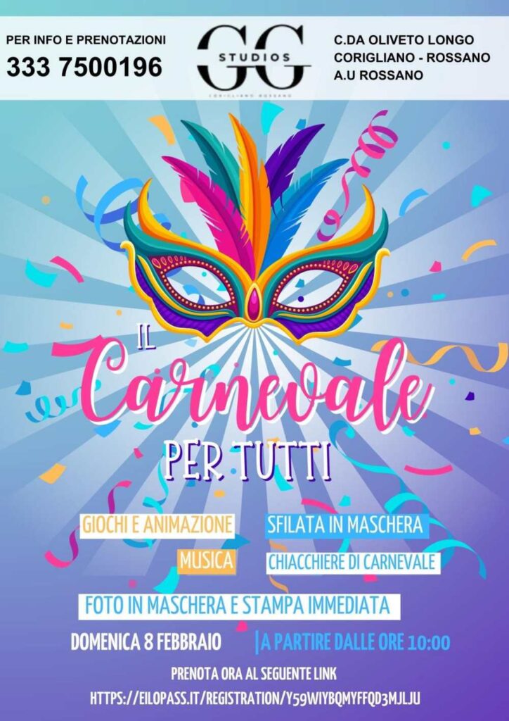 Gli Studios di Corigliano-Rossano aprono le porte alla magia del Carnevale con l’evento “Il Carnevale per Tutti”, una giornata speciale dedicata a bambini, famiglie e scuole all’insegna del divertimento, della musica e della condivisione.