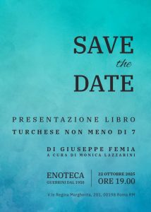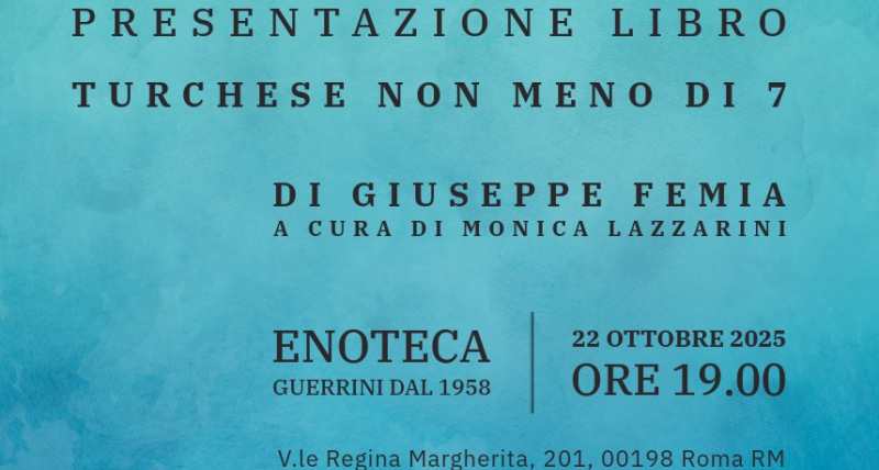 Mercoledì 22 ottobre alle ore 19 all’enoteca Guerrini in viale Regina Margherita a Roma si terrà la presentazione del libro di Giuseppe Femia, Turchese non meno di sette.