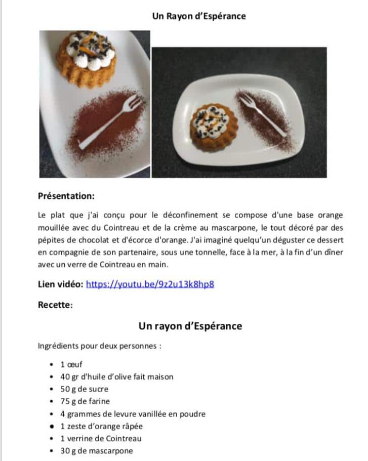 Gli studenti hanno ricevuto in carico alcune regole da rispettare: l’obbligo di dare un nome (in italiano o francese) al proprio piatto, utilizzando giochi di parole, semplicemente modificate, diventate ormai familiari negli ultimi mesi, tipo: quarantena, confinamento, distanziamento sociale, ecc.; scrivere la ricetta (in francese e in italiano); realizzare la ricetta e presentarne gli ingredienti e le fasi salienti della preparazione attraverso un video (in francese e poi in italiano per la valutazione cucina); descrivere il contesto nel quale si immagina di condividere questo piatto emblematico del de-confinamento; preparare la ricetta indossando la divisa da cuoco completa e rispettando le norme igieniche.