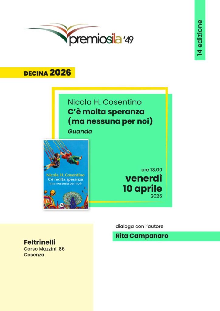 Venerdì 10 aprile, alle 18, alla libreria Feltrinelli di corso Mazzini a Cosenza, il Premio Sila presenta il terzo appuntamento con gli autori della Decina 2026: Nicola H. Cosentino con “C’è molta speranza (ma nessuna per noi)” di Guanda editore.