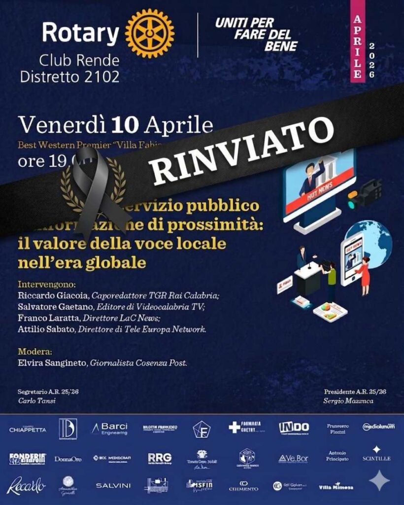 A nome del Presidente del Rotary Club Rende, Sergio Mazzuca, si comunica che l’incontro previsto per domani sera, venerdì 10 aprile, dal titolo “TV private, servizio pubblico e informazione di prossimità: il valore della voce locale nell’era globale” è rinviato a data da destinarsi, in segno di cordoglio per la prematura scomparsa dell’amato giornalista Domenico Martelli.