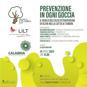 La prevenzione inizia dalla tavola, per il presidente Magliocchi. “La sinergia tra la Lilt e il Consorzio Olio di Calabria IGP vuole sottolineare l’importanza di fare fronte comune per tutelare la salute delle persone, puntando sulla prevenzione sanitaria e alimentare come prima arma di difesa nella lotta ai tumori. Siamo orgogliosi di essere al fianco della LILT in questo impegno nella corretta diffusione di abitudini alimentari sane, alla base di uno stile di vita salutare”, le sue parole, prima dell’evento a Verona. L’incontro in fiera è un’occasione unica per far conoscere le proprietà benefiche del nostro oro verde a tutti gli italiani e allo stesso tempo “per contribuire al raggiungimento del traguardo comune di un futuro senza cancro”.