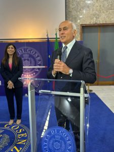 Prima di aprire al pubblico l’esposizione della Davis, una breve cerimonia ha salutato l’arrivo della Coppa in città. A fare gli onori di casa, in un salone di rappresentanza gremito di autorità, cittadini e dei piccoli studenti della quinta elementare del plesso di via Milelli dell’Istituto comprensivo “Bonaventura Zumbini”, è stato il Sindaco Franz Caruso che non ha nascosto la sua soddisfazione dicendosi “particolarmente orgoglioso del fatto che la Federazione Italiana Tennis abbia scelto Cosenza per questo importante momento. Per la prima volta – ha detto ancora il primo cittadino -questo trofeo così significativo e carico di valori e di importanza, non solo per il tennis, ma per lo sport in genere, arriva qui a Cosenza. Credo non sia un caso – ha ben spiegato Franz Caruso – perché Cosenza dal punto di vista tennistico vanta una nobile tradizione e ha profonde radici”. E il Sindaco ha ricordato che Cosenza ha espresso diversi e validissimi giocatori: da Pino Abate, presente oggi in Comune e con un incarico importante nella Federtennis, come membro della prestigiosa commissione per l’alta formazione (la cosìdetta commissione Lombardi), ma anche Vittorio Magnelli, attualmente responsabile del settore tecnico femminile della Federazione Italiana Tennis, e il giornalista Francesco Kostner. “Tutti espressione del tennis cosentino – ha aggiunto Franz Caruso – che non sarà arrivato ai livelli dei Panatta, Bertolucci, e degli altri, e oggi di Sinner, ma ha dato molto al tennis regionale e nazionale”. Franz Caruso ha espresso un po’ di rammarico per le non molte strutture sportive dedicate al tennis presenti in città, “ma un evento del genere, così importante e significativo come l’arrivo della Coppa Davis a Cosenza – ha rimarcato il Sindaco – potrà rappresentare l’inizio di un nuovo percorso che insieme alla federazione italiana e a quella regionale, che non finirò di ringraziare per il privilegio che ha dato alla nostra città, per aver portato la Coppa Davis nella casa dei cittadini, potremo tracciare per tornare a dotarci di strutture importanti che potranno in futuro ospitare manifestazioni di livello nazionale ed internazionale”. Per Franz Caruso praticare il tennis e lo sport in generale è di grande utilità “non solo dal punto di vista agonistico, ma anche dal punto di vista sociale, perché lo sport aiuta a crescere e a stare insieme. Lo sport detta delle regole e una società senza regole non è una società libera e democratica. Noi dobbiamo fare in modo – ha detto inoltre il Sindaco – che la nostra città possa consentire a tutti di praticare lo sport, perché sappiamo che lo sport è sacrificio, passione, ma purtroppo per praticarlo devono affrontarsi dei costi che non tutti possono permettersi. Il nostro impegno -ha aggiunto- è fare in modo, invece, che tutti possano accedere allo sport senza distinzione alcuna e praticare una disciplina sportiva, facendo emergere il proprio talento, a volte nascosto. Cosenza – ha concluso Franz Caruso – è veramente una bandiera dello sport e oggi raccoglie questo testimone da parte della Federazione italiana tennis e padel, come città che deve guidare la rinascita dello sport nella nostra regione, a partire dal momento più significativo e importante che vivremo da qui a pochi mesi, perché un nostro atleta, il campione di tuffi Giovanni Tocci, ci rappresenterà alle Olimpiadi di Parigi”.