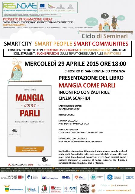 Il seminario Smart City, per questo appuntamento, effettuato con la collaborazione di Fidapa Cosenza, Slow Food e Libreria Mondadori, vertirà sul tema del cibo con la presentazione del libro “Mangia come parli” con l’autrice Cinzia Scaffidi vicepresidente nazionale Slow Food Italia, e sarà l’occasione anche per riflettere sulla propria identità e sulle origini.