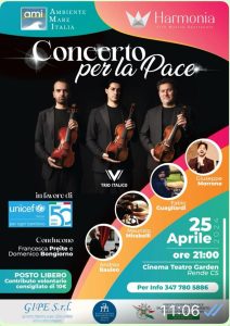 Il Trio Italico, composto da Antonio De Paoli, Pasquale Allegretti Gravina e Andrea Micieli, insieme a un talentuoso ensemble di musicisti, terrà il “Concerto per la pace” il 25 aprile (ore 21) presso il Cinema Teatro Garden di Rende. Il mondo della musica si unisce per una serata indimenticabile all’insegna della pace e della solidarietà. L’evento, organizzato dalla delegazione Cosenza-Tropea di Ambiente Mare Italia (AMI) e dall’associazione Harmonia, è stato voluto dal Trio Italico con l’obiettivo di raccogliere fondi per sostenere i bambini di Gaza attraverso l’Unicef.