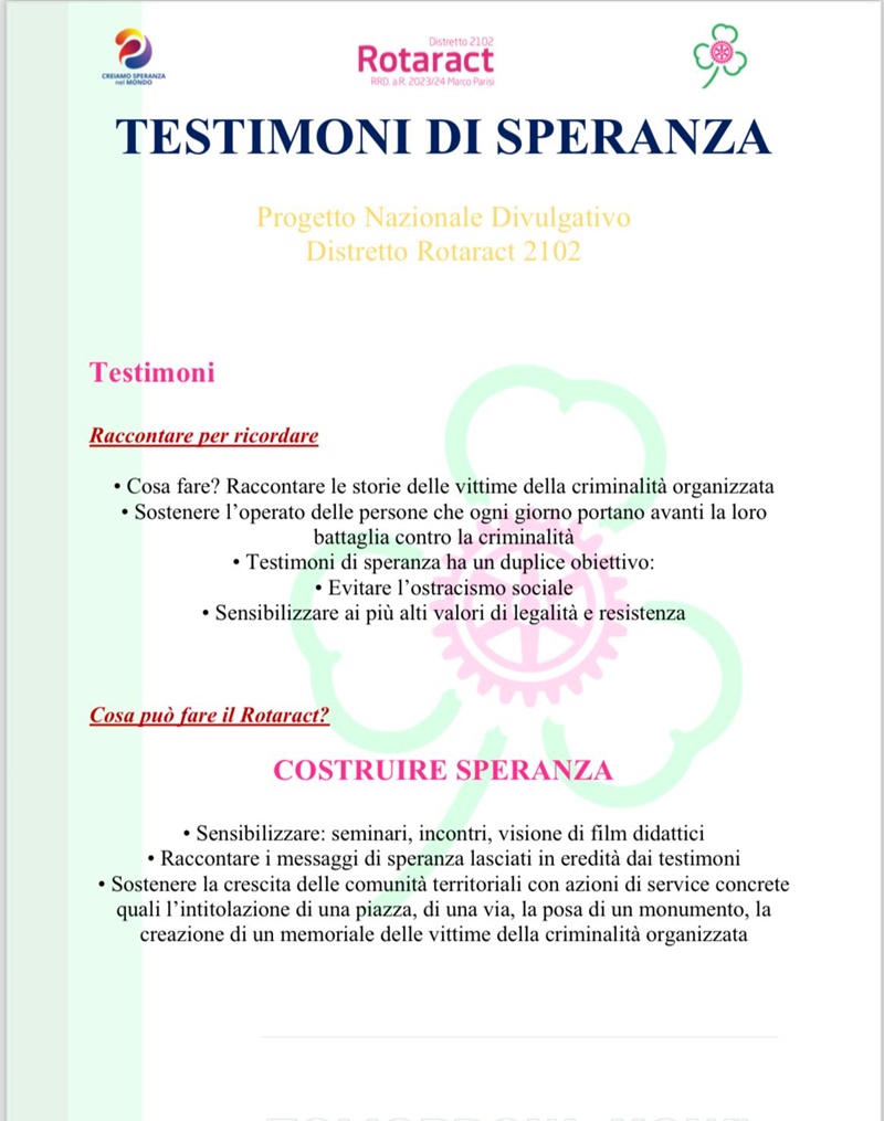 Il giardino sarà soprattutto un luogo dove i bambini e i ragazzi potranno crescere in armonia guardando quella targa che esprime cordoglio per quelle vittime innocenti.L’evento è stato reso possibile e patrocinato dal Comune di Rende, per il quale sono intervenuti: il commissario Prefettizio Santi Giuffrè, il comandante della Polizia Municipale Alfredo Ferraro, l’architetto Andrea Sorrentino e altre autorità. Tutto questo si rifà al progetto nazionale “Testimoni di speranza”, che ha l’obiettivo di evitare l’ostracismo sociale con iniziative di questo tipo. Da molto tempo ormai l’organizzazione fondata da Paul Harris porta avanti manifestazioni che hanno al centro temi rilevanti.
