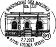 Poste Italiane ha attivato per sabato 2 luglio, un servizio filatelico temporaneo con bollo speciale con la dicitura: “Inaugurazione Casa massonica – 2.7.2022 – 87100 Cosenza Veneto”