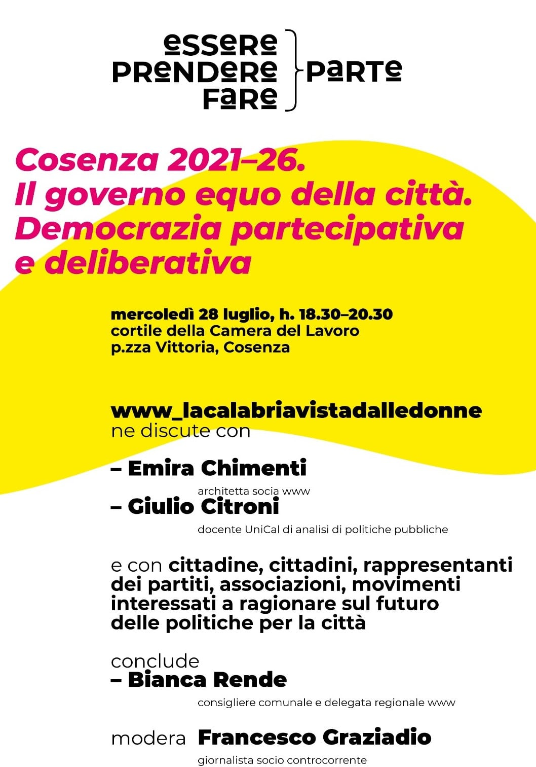All’incontro, moderato dal giornalista Francesco Graziadio interverranno Emira Chimenti, architetta socia www, il prof, Claudio Citroni, docente Unical di analisi di politiche pubbliche e Bianca Rende, consigliera comunale e delegata regionale