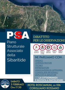 Sabato 3 Febbraio alle ore 17:30 presso l’Hotel Roscianum di Corigliano Rossano, avrà luogo un incontro riguardante il Piano Strutturale Associato della Sibaritide. L’evento, aperto al pubblico, sarà dedicato al dibattito sulle osservazioni relative a questo importante piano, coinvolgendo i comuni di Corigliano Rossano, Cassano, Calopezzati e Crosia.