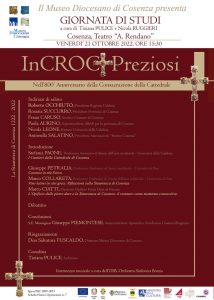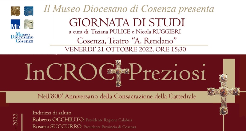 È dedicata alla preziosa Stauroteca la giornata di studio ‘Incroci preziosi’, curata dagli architetti Tiziana Pulice e Nicola Ruggieri, in programma venerdì 21 ottobre alle ore 15,30 al teatro Alfonso Rendano. L’iniziativa, che gode inoltre del patrocinio del Comune di Cosenza e della Provincia di Cosenza, rientra nel calendario delle celebrazioni degli 800 anni della Cattedrale, ed è promossa dall’ Ente Cattedrale di Cosenza, dal Museo Diocesano e dall’associazione 8centoCosenza aps, con il contributo della Regione Calabria.