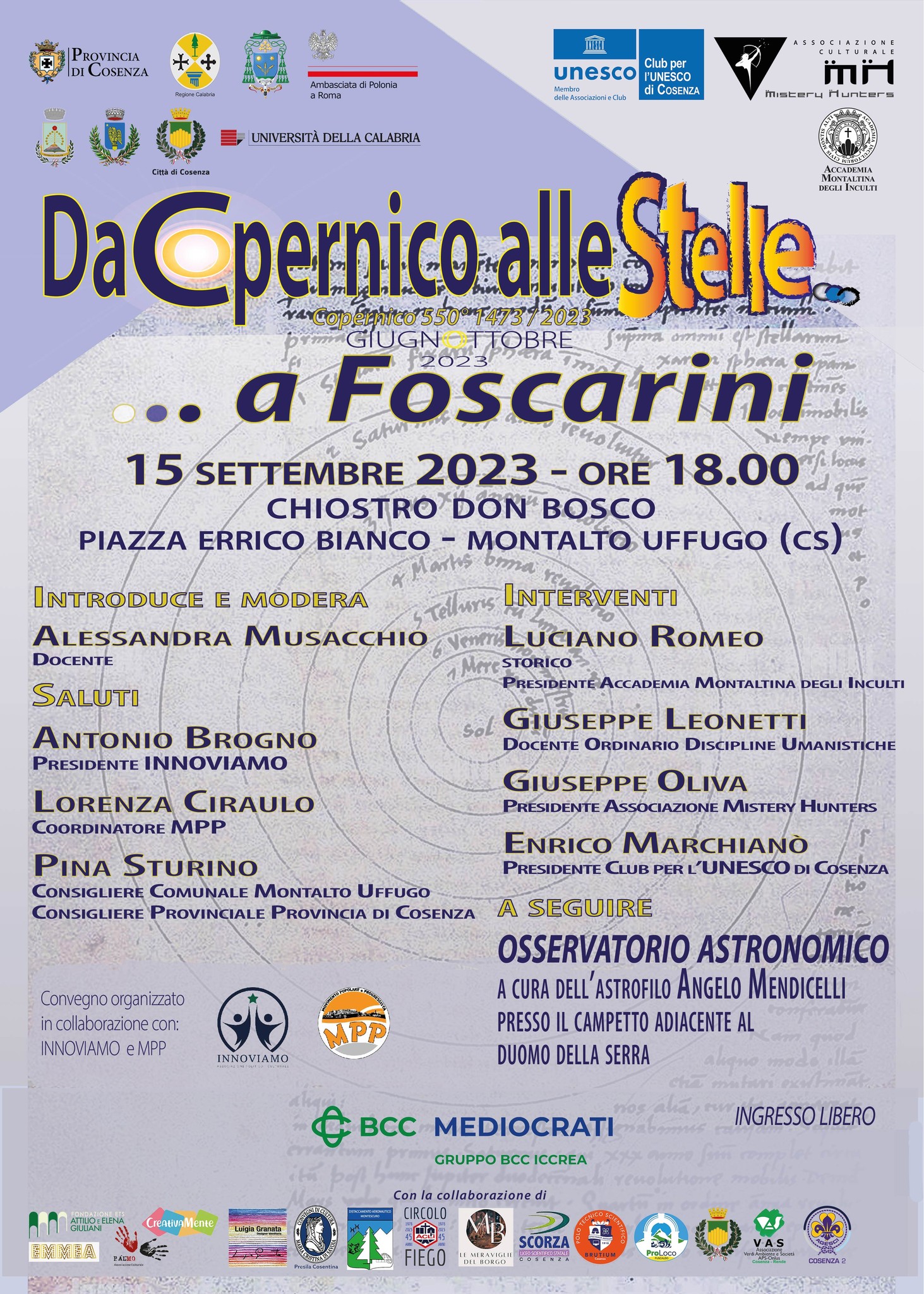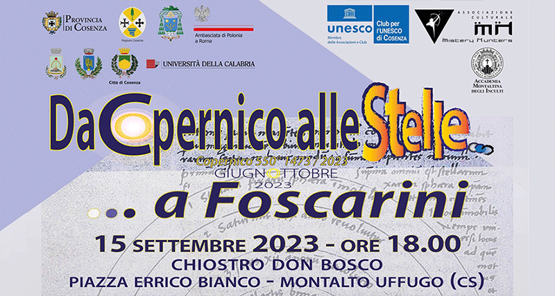 Il progetto è stato fortemente abbracciato dall’Associazione Politico-Culturale Innoviamo e dal Movimento Popolare Progressista, entrambi con sede in Montalto Uffugo, i quali, con l’intento di valorizzare la cultura locale della nostra città, organizzano nel giorno di venerdì 15 Settembre 2023 alle ore 18.00, presso il Chiostro “Don Bosco” P.zza Errico Bianco (Montalto Uffugo), il convegno culturale “Da Copernico alle stelle… a Foscarini”.