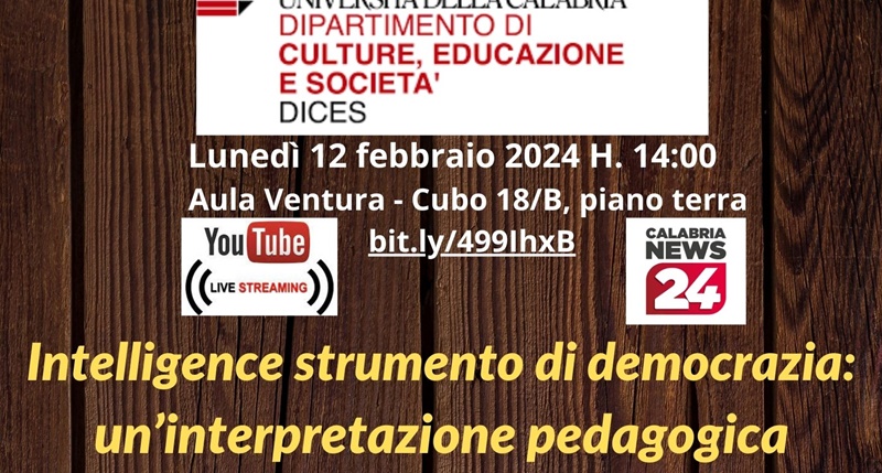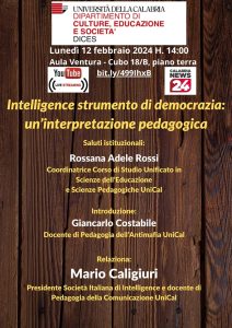 “Intelligence strumento di democrazia: un’interpretazione pedagogica” è il tema della lezione che Mario Caligiuri, presidente della Società Italiana di Intelligence (SOCINT), terrà lunedì 12 febbraio alle 14:00 presso l’aula Ventura (cubo 18/B, piano terra) dell’Università della Calabria nell’ambito delle attività del progetto di Pedagogia dell’Antimafia attivo presso il Dipartimento di Culture, Educazione e Società. L’incontro sarà aperto dai saluti istituzionali di Rossana Adele Rossi, coordinatrice del Corso di Studio Unificato in Scienze dell’Educazione e Scienze Pedagogiche dell’ateneo, e prevede l’introduzione ai lavori di Giancarlo Costabile, docente della disciplina di Antimafia. La manifestazione sarà trasmessa in streaming dal canale youtube di Calabria News 24 all’indirizzo: https://bit.ly/499IhxB
