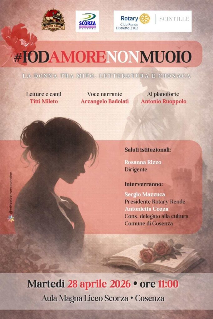 #Iodamorenonmuoio: è il titolo del recital teatrale tratto dal libro del giornalista e scrittore Arcangelo Badolati edito dalla Pellegrini di Cosenza (i diritti sono interamente devoluti in beneficenza) con la prefazione di Matilde Lanzino, madre della studentessa rendese stuprata e uccisa nel luglio del 1988. Il recital sarà messo in scena martedì 28 aprile, alle 11, nell’auditorium del Liceo “Scorza” alla presenza degli studenti e delle studentesse dell’istituto cosentino. L’iniziativa è promossa dal Rotary di Rende, presieduto dall’imprenditore Sergio Mazzuca, fondatore e titolare della gioielleria “Scintille”, con il contributo di Antonietta Cozza delegata alla Cultura del Comune di Cosenza e della dirigente scolastica Rosanna Rizzo.