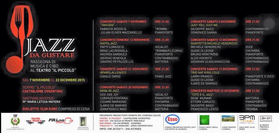 Dal 7 novembre al 22 dicembre al Teatro “Il Piccolo” di Castiglione Cosentino la rassegna “Jazz da gustare”. Una serie di concerti di primissimo ordine nel panorama jazzistico accompagneranno degustazioni enogastronomiche
