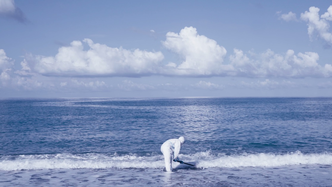 La video-performance “Hoeing the Sea”, attraverso l’immagine di un uomo che zappa incessantemente il mare indossando una tuta anti-contagio, incarna una potente metafora delle sfide e delle contraddizioni della società contemporanea in un tempo che vede coesistere un’ultra-digitalizzazione e le conseguenze globali antropocentriche.