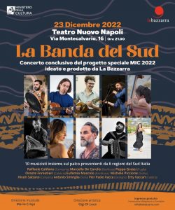 I giovani musicisti coinvolti si esibiranno sul palco del Teatro Nuovo di Napoli venerdì 23 dicembre, dalle ore 21. Il concerto rappresenterà la finalizzazione della residenza artistica che impegna in questi giorni i musicisti a Torre del Greco, fino al 23 dicembre, sotto l’egida di un festival storico come Ethnos (dal 1995 a Napoli e nei comuni vesuviani) con la sua sezione Ethnos Gener/Azioni divenuta osservatorio giovanile. Si esibiranno Raffaele Califano, Marcello De Carolis, Peppo Grassi, Oreste Forestieri, Eufemia Mascolo, Michele Piccione, Hiram Salzano, Antonio Smiriglia, Pier Paolo Vacca ed Emy Vaccari. “La Banda del Sud, premiato come progetto speciale del 2022 dal Ministero della Cultura, testimonia l’intento di sviluppare azioni professionali di internazionalizzazione della musica del Sud Italia, portandola in giro per il mondo e costruendo per il futuro ponti culturali con il Mediterraneo” spiega Gigi Di Luca.