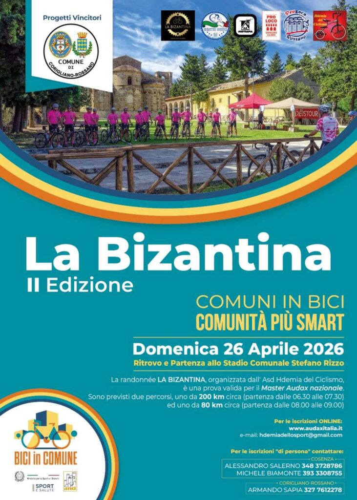 Si terrà domenica 26 aprile la seconda edizione di “Comuni in Bici – Comunità più smart“, denominata “La Bizantina – II edizione”, un appuntamento ormai atteso che unisce sport, promozione del territorio e benessere. L’evento, con ritrovo e partenza dallo stadio comunale “Stefano Rizzo“, coinvolgerà il territorio di Corigliano-Rossano e numerosi comuni limitrofi, offrendo ai partecipanti un’esperienza unica tra le bellezze dei nostri territori ed in particolare del nostro Comune.