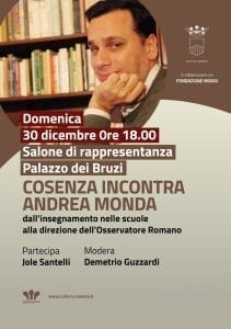 Ospite dell’Amministrazione comunale, il giornalista e scrittore Andrea Monda, oggi alla guida del prestigioso quotidiano d’informazione della Santa Sede.L’appuntamento, moderato da Demetrio Guzzardi e a cui parteciperà Jole Santelli, nasce dal desiderio di creare un incontro tra la città e un suo figlio illustre.