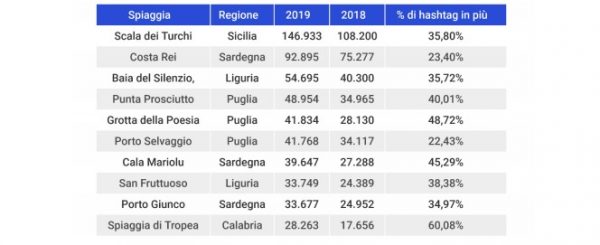 Al 15esimo e al 16esimo posto torna la Sardegna, con Cala di Volpe e Su Giudeu, nella località di Chia, che rispettivamente contano 19.226 e 17.936 hashtag, con un incremento di più del 20% entrambe. Al 17esimo posto Positano, che con 17.398 hashtag registra un incremento fenomenale di più del 77% in popolarità! Al 18esimo, con quasi 15mila hashtag Porto Badisco in Puglia, con un incremento del 33%. Con quasi 11.000 hashtag, la Tonnara di Scopello in Sicilia, con un incremento notevole del 66%, si ferma al 19esimo posto. Chiude la Top20 la Liguria, con la famosissima Baia dei Saraceni, con un totale di 10.119 hashtag.