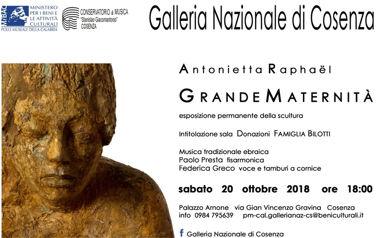 Il patrimonio della Galleria Nazionale di Cosenza si arricchisce della scultura Grande Maternità di Antonietta Raphaël (Vilnius 1895 – Roma 1975). L’opera giunge nelle collezioni del museo per volontà del donante, Roberto Bilotti Ruggi d’Aragona, con decisione condivisa da Giulia Mafai, figlia dell’artista; a conclusione di un delicato intervento di restauro sarà esposta da sabato 20 ottobre 2018, alle ore 18.00, accanto alle sculture di Giorgio de Chirico, Emilio Greco, Pietro Consagra, Mimmo Rotella completando, nella sala dedicata, il nucleo donato dalla Famiglia Bilotti. Per l’occasione la Galleria Nazionale di Cosenza osserverà un’apertura straordinaria degli spazi espositivi fino alle ore 21.00.