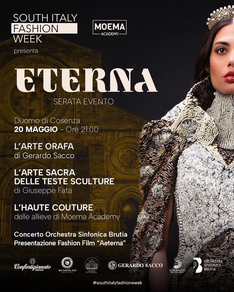 Se nelle edizioni precedenti l’attesa era tutta per il gran finale, quest’anno lo spettacolo comincia fin da subito con un appuntamento emozionante: la settimana, infatti, si apre in grande stile con una soirée che promette di incantare. Martedì 20 maggio, alle ore 21.00, il Duomo di Cosenza ospiterà “Eterna – Serata Evento”, una performance suggestiva che unirà le arti in uno spettacolo unico: l’Arte orafa di Gerardo Sacco, le Head Sculptures di Giuseppe Fata, l’Haute Couture delle allieve di Moema Academy, il Concerto dell’Orchestra Sinfonica Brutia diretta dal Maestro Francesco Perri e l’anteprima del fashion film “Aeterna”, prodotto da Big Digital Eye e Moema Academy. Special guest della serata, il fashion designer Dimitar Dradi, con la sua visione scenografica e avanguardista.