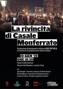 “La rivincita di Casale Monferrato”, il documentario-inchiesta che racconta il riscatto di un’intera comunità contro Eternit, la più grande fabbrica di cemento-amianto d’Europa, verrà presentato al Chiostro Caffè Letterario di Lamezia Terme sabato 19 gennaio alle 18:30.
