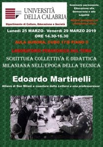 La Scuola di Barbiana all’Università della Calabria per costruire una Didattica della cittadinanza e della giustizia sociale. E’ questo l’obiettivo del Laboratorio di Scrittura collettiva e didattica milaniana nell’epoca della tecnica che si terrà ad Arcavacata a partire da lunedì 25 marzo fino a venerdì 29, dalle 14.30 alle 16.30 presso l’aula Aurora, ubicata al piano 0 del cubo 17/B.