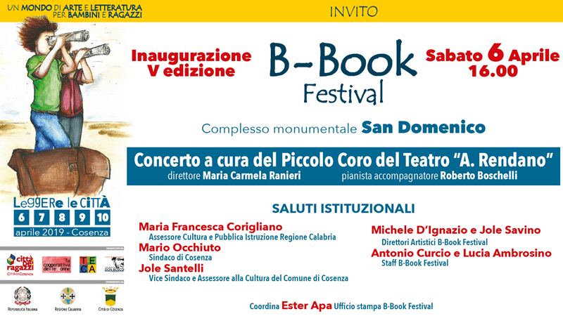 Al via sabato 6 aprile alle ore 16.00 presso il Complesso monumentale di San Domenico, alla presenza dell’Assessore alla Cultura della Regione Calabria Maria Francesca Corigliano, del Sindaco e dell’Assessore alla Cultura del Comune di Cosenza , Mario Occhiuto e Jole Santelli, la V edizione del B-Book Festival – un mondo di arte e letteratura per bambini e ragazzi.