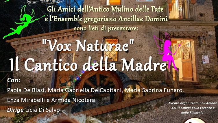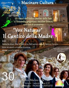 Dopo l’evento “Le vie del grano” svoltosi a Falerna domenica scorsa, il “Festival delle Erranze e della Filoxenia” si trasferisce di nuovo a Lamezia Terme presso l’Antico Mulino delle Fate (Rione Niola del centro storico di Nicastro, alle spalle del Castello Normanno Svevo, nella valle del Torrente Canne), che, sabato 30 luglio alle 18,15 ospiterà il coro “Ancillae Domini” per un concerto di canti medievali dal titolo “Vox nature – Il Cantico della Madre”.