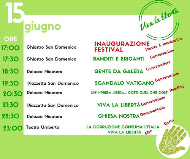 La celebre kermesse, giunta ormai alle sesta edizione, che reca la firma lametina del Presidente della fondazione Armando Caputo e del direttore artistico Savatteri, quest’anno si anima dello slogan “Viva le libertà”, tratto dalla citazione cinematografica dell’omonimo film di Roberto Andò: “Libertà di combattere, di credere, di sperare”.