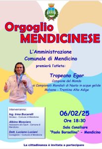 La comunità di Mendicino, suo paese di origine, domani pomeriggio premierà l’atleta Tropeano Egor, reduce dai campionati del mondo di nuoto in acque gelide, nel corso dei quali ha regalato all’Italia il titolo mondiale assoluto nei 100 metri rana.