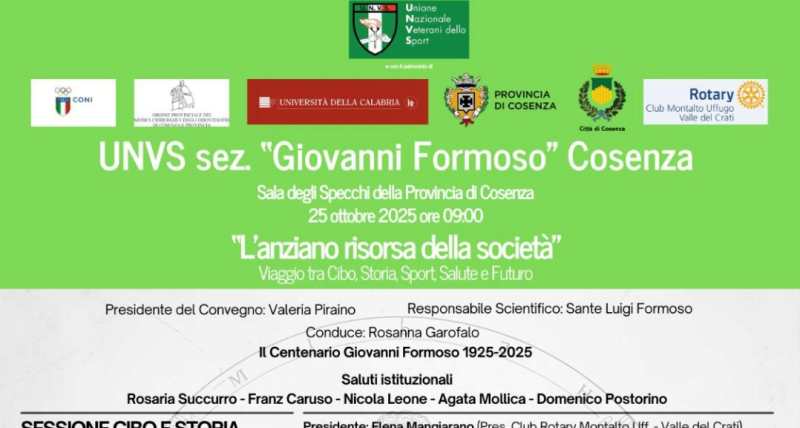 Nella suggestiva cornice della Sala degli Specchi della Provincia di Cosenza, la sezione “Giovanni Formoso” dell’UNVS (Unione Nazionale Veterani dello Sport) ha promosso il convegno dal titolo “L’anziano risorsa della società. Viaggio tra Cibo, Storia, Sport, Salute e Futuro”, un evento che ha unito riflessione, celebrazione e impegno civile in occasione del centenario dalla nascita di Giovanni Formoso (1925–2025), figura emblematica dello sport e della cultura calabrese.