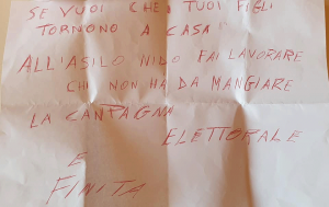 “SE VUOI CHE I TUOI FIGLI TORNONO A CASA, ALL’ASILO NIDO FAI LAVORARE CHI NON HA DA MANGIARE”. A seguire “LA CAMPAGNA ELETTORALE E FINITA”.