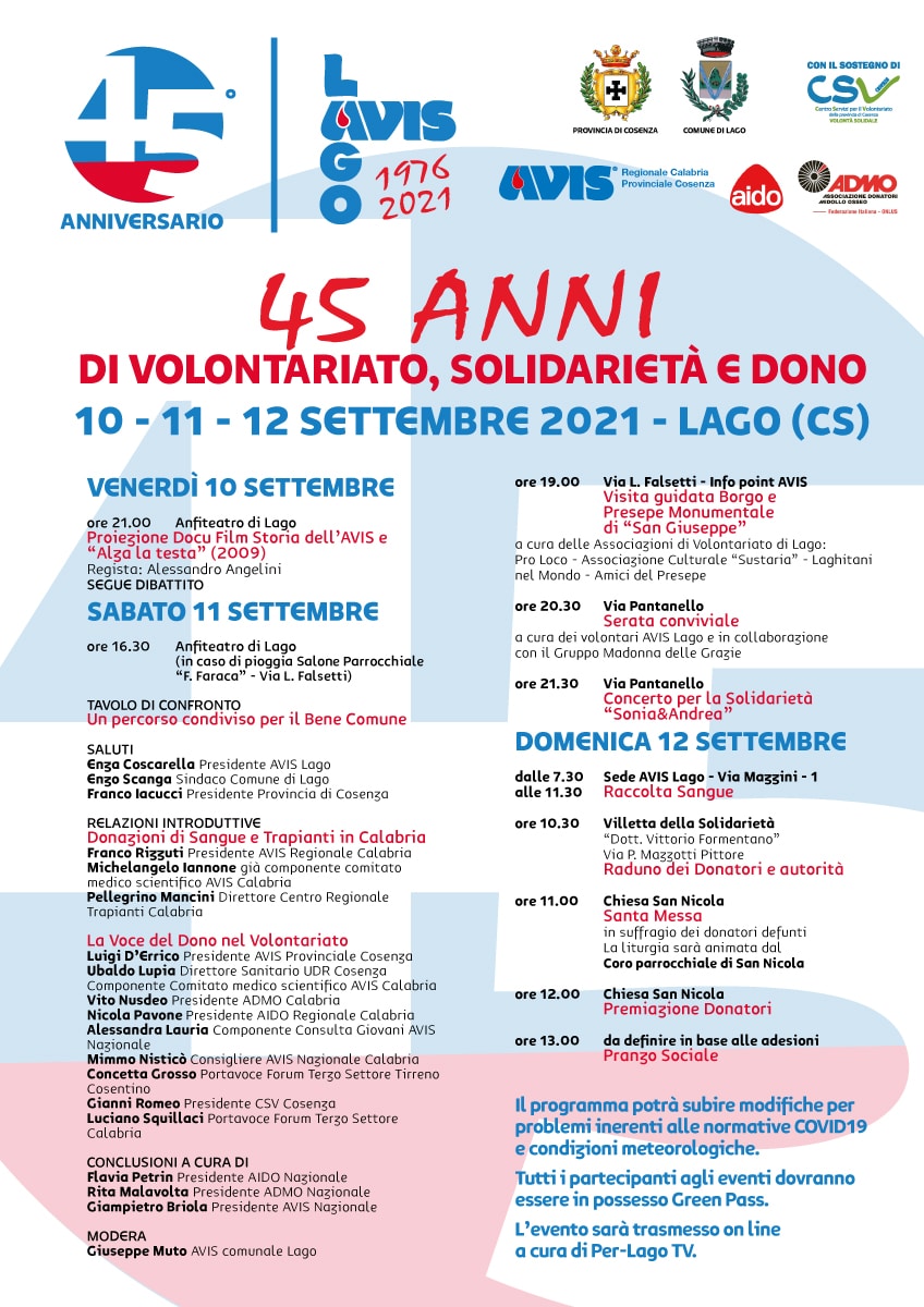 L’evento “45 anni di volontariato, solidarietà e dono” ha il patrocinio della Provincia di Cosenza, del Comune di Lago, dell’Avis regionale e provinciale ed è sostenuto dal CSV Cosenza nell’ambito delle Map (Micro azioni partecipate).