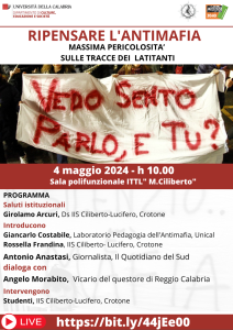 Nuova tappa del percorso di studio “Ripensare l’Antimafia” organizzato, nell’ambito del progetto nazionale Barbiana 2040 – rete giuridica di scuole, dal corso universitario di Pedagogia dell’Antimafia, attivo presso il Dipartimento di Culture, Educazione e Società dell’Università della Calabria, e dall’Istituto Ciliberto di Crotone