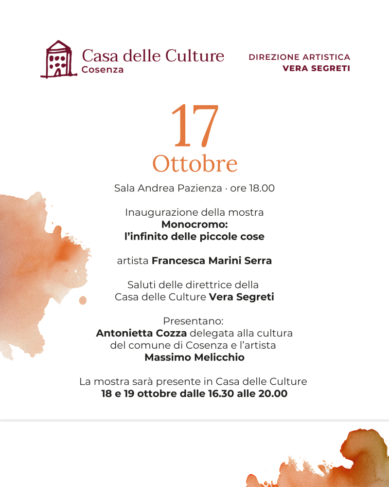 A presentare la mostra saranno Antonietta Cozza, delegata alla cultura del Comune di Cosenza, e l’artista Massimo Melicchio. La mostra sarà visitabile negli spazi della Casa delle Culture anche 18 e 19 ottobre, dalle 16.30 alle 20.