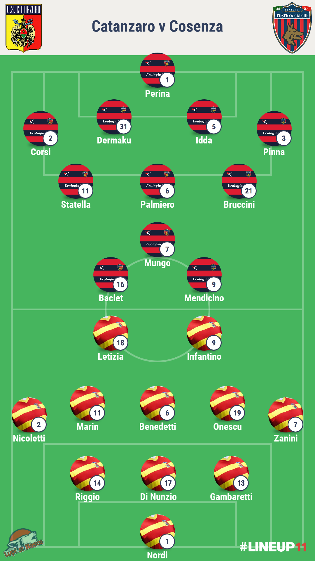QUI CATANZARO Il tecnico dei padroni di casa Davide Dionigi non potrà contare su Cunzi e Anastasi, mentre Icardi e Maita sono parzialmente ristabiliti ma ancora lontani dalla condizione migliore. Lo squalificato Sirri sarà rimpiazzato col giovane Riggio. Centrocampo rinfoltito da Benedetti, dal rientrante Onescu e da Marin. Sulle corsie laterali spingeranno Zanini e Nicoletti. Inamovibile al centro dell’attacco il puntero Infantino, gli farà da spalla l’ex Tony Letizia.