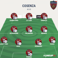 COSENZA (4-3-3): Perina; Corsi, Dermaku, Idda, Legittimo; Mungo, Palmiero, Sciaudone; Embalo, Litteri, Garritano. A disp.: Saracco, Capela, Hristov, Bittante, Bruccini, Schetino, Báez. All. Braglia.