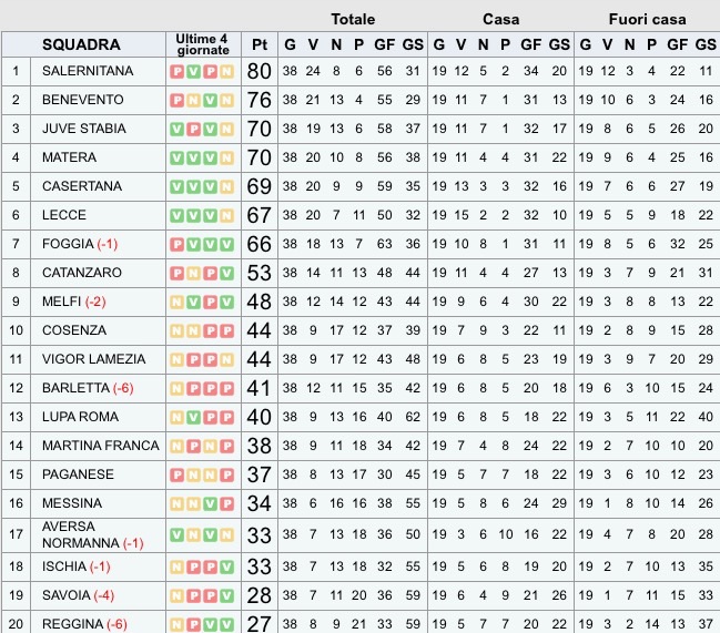 Con il 38º turno si completa la stagione 2014/2015 del Girone C di Lega Pro. La Salernitana ha chiuso con un pareggio per 1-1 tra le mura amiche con la Casertana (rossoblù fuori dalla griglia playoff), granata comunque già promossi in Serie B da domenica scorsa. Pareggia 1-1 il Matera in casa dell’Aversa Normanna, i lucani conquistano l’accesso ai playoff da terzi in classifica in virtù della miglior differenza reti rispetto alla Juve Stabia, vespe che non vanno oltre i pareggio con il Benevento già sicuro del secondo posto.