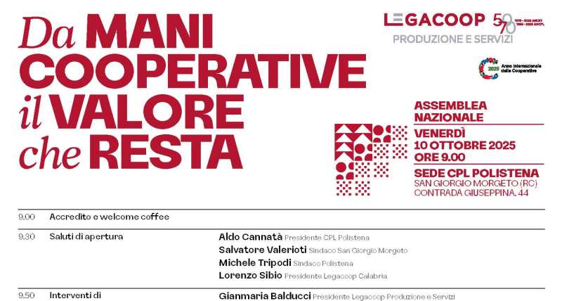 Legacoop Produzione e Servizi sceglie la Calabria per la propria Assemblea Nazionale 2025, intitolata “Da mani cooperative il valore che resta”: un’edizione speciale che celebra 70 anni di ANCPL e 50 anni di Legacoop Servizi, le due storiche associazioni che nel 2018 hanno dato vita a Legacoop Produzione e Servizi. Un doppio anniversario che diventa occasione per riflettere sulla storia del movimento cooperativo e sulle sfide del futuro.
