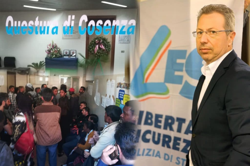 «Un giorno di “straordinaria follia” quello trascorso all’ufficio immigrazione della Questura di Cosenza presso il quale siamo passati per salutare ed ascoltare i colleghi. Non avremmo mai immaginato né pensato che l’Ufficio Immigrazione si potesse trovare in una situazione così disastrosa!» così esordisce Renato Guaglianone, Segretario Generale Provinciale del sindacato di Polizia LeS (Libertà e Sicurezza), che ha poi proseguito: «una folla di stranieri con un poliziotto che indossa indumenti non più idonei a svolgere qualsiasi servizio di polizia, con ancora indosso il famoso cinturone di cartone bianco che tanto ha fatto discutere nei fatti di Trieste.