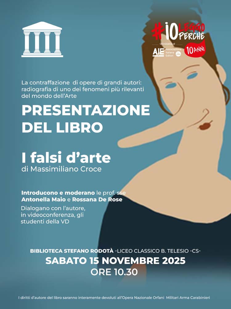 Il capitano Massimiliano Croce, comandante della compagnia Carabinieri di Città di Castello, nonché specializzato in Scienze criminologiche e del Patrimonio, in collegamento video con gli studenti del Telesio, per parlare loro del suo libro su: “I Falsi d’Arte”, fenomeno che si concentra massicciamente sull’arte contemporanea e che negli anni ’60 e ’70, col boom economico, ha visto nascere una nuova classe di acquirenti desiderosi di opere per status symbol e investimento, alimentando una richiesta smodata che i falsari hanno intercettato.