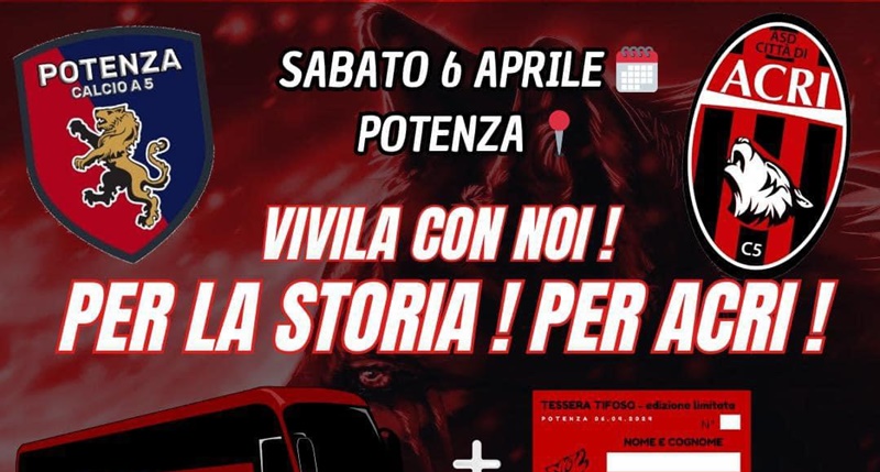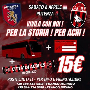 La società Città di Acri C5 mette a disposizione un autobus per raggiungere insieme alla tifoseria la città di Potenza, dove si terrà la cruciale partita che potrebbe sentenziare la promozione della società acrese nel campionato di Serie A2 Nazionale di Futsal (Calcio a 5), incredibile traguardo che segnerebbe un precedente storico per la città ma anche per tutta la provincia e regione.