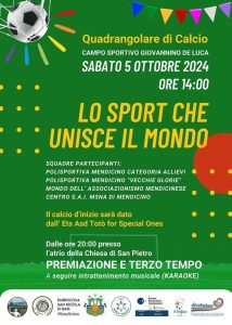 Il Quadrangolare di Calcio organizzato dall’associazione Prometeus vedrà coinvolte la POLISPORTIVA MENDICINO, le associazioni presenti sul territorio di Mendicino ed i ragazzi del centro S.A.I MSNA di Mendicino, un evento atto a coinvolgere tutti e a ricalcare il termine “squadra” .