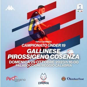 Domenica 29 ottobre (calcio d’inizio alle ore 16:00), al PalaBoccioni di Reggio Calabria, la Pirossigeno Cosenza Under 19 allenata da mister Giuseppe Alfarano farà visita alla Gallinese.