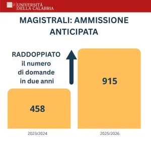 Le lauree magistrali all’Università della Calabria diventano più attrattive, e lo fanno in maniera decisa. Negli ultimi due anni il numero delle domande di ammissione anticipata è quasi raddoppiato, passando da 458 nell’anno accademico 2023/2024 a 619 nel 2024/2025, fino ad arrivare alle 915 richieste per il 2025/2026. Un incremento del 48% rispetto all’anno scorso che segna una svolta significativa per un segmento dell’offerta formativa che, storicamente, rappresentava una delle aree più fragili dell’ateneo, anche per via della crescente migrazione dei laureati delle triennali calabresi verso atenei del nord e università telematiche. Il dato è ancora più rilevante se si considera che si tratta solo delle candidature raccolte nella fase di ammissione anticipata, chiusa il 3 luglio. A queste si aggiungeranno, a fine estate, le domande della fase ordinaria di iscrizione prevista tra il 29 agosto e l’11 settembre e quelle dei Paesi extra UE relative ad UnicalAdmission.
