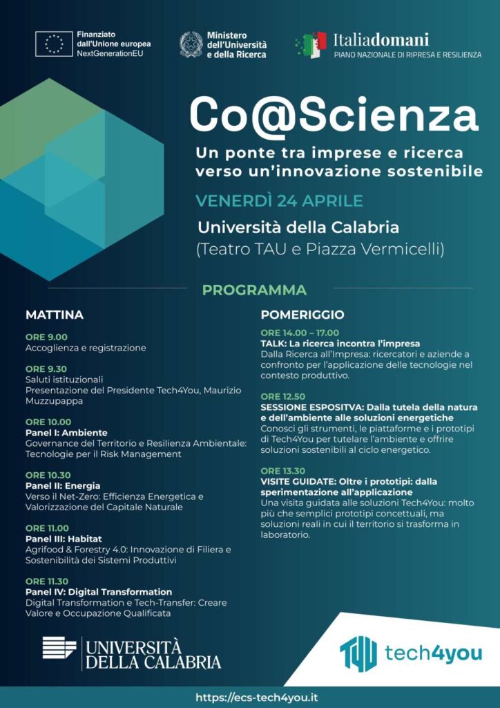 È questo lo spirito di “Co@Scienza – Un ponte tra imprese e ricerca verso un’innovazione sostenibile”, l’evento di presentazione dei risultati dei ricercatori e delle ricercatrici Unical che hanno lavorato in Tech4You, il più ambizioso progetto di ricerca industriale mai attuato sul territorio. L’Ateneo, attore centrale dell’Ecosistema finanziato dal MUR con 121,5 milioni di euro, restituisce a cittadini, istituzioni e imprese i frutti di tre anni e mezzo di lavoro intenso, finalizzato a costruire un futuro più verde e tecnologicamente avanzato tra Calabria e Basilicata.