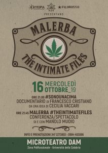 A quasi tre anni dal debutto di “Malerba. Appunti per una coltura psichedelica”, performance di teatro e musica realizzata in collaborazione con il cantastorie Biagio Accardi e l’associazione Cattivo Teatro, Manolo Muoio torna a riflettere sulla canapa e i suoi molteplici legami con la Storia e le culture umane. La conferenza/spettacolo “Malerba_theintimatefiles” andrà in scena al DAM dell’Unical mercoledì 17 ottobre 2019, per un evento organizzato da Associazione Culturale Entropia e Filorosso, in collaborazione con l’associazione Le Cime. La serata sarà aperta proprio da Le Cime, alle ore 21, con la proiezione del documentario dal titolo “Sono una cima” di Francesco Cristiano, da un’idea di Cecilia Vaccari. Il documentario è un intrecciarsi di storie di vita personali, fatica e speranze, che fotografa l’attuale situazione calabrese sul mondo della canapa, ma che si concentra sulle vicende dei tre protagonisti nel loro percorso associativo.