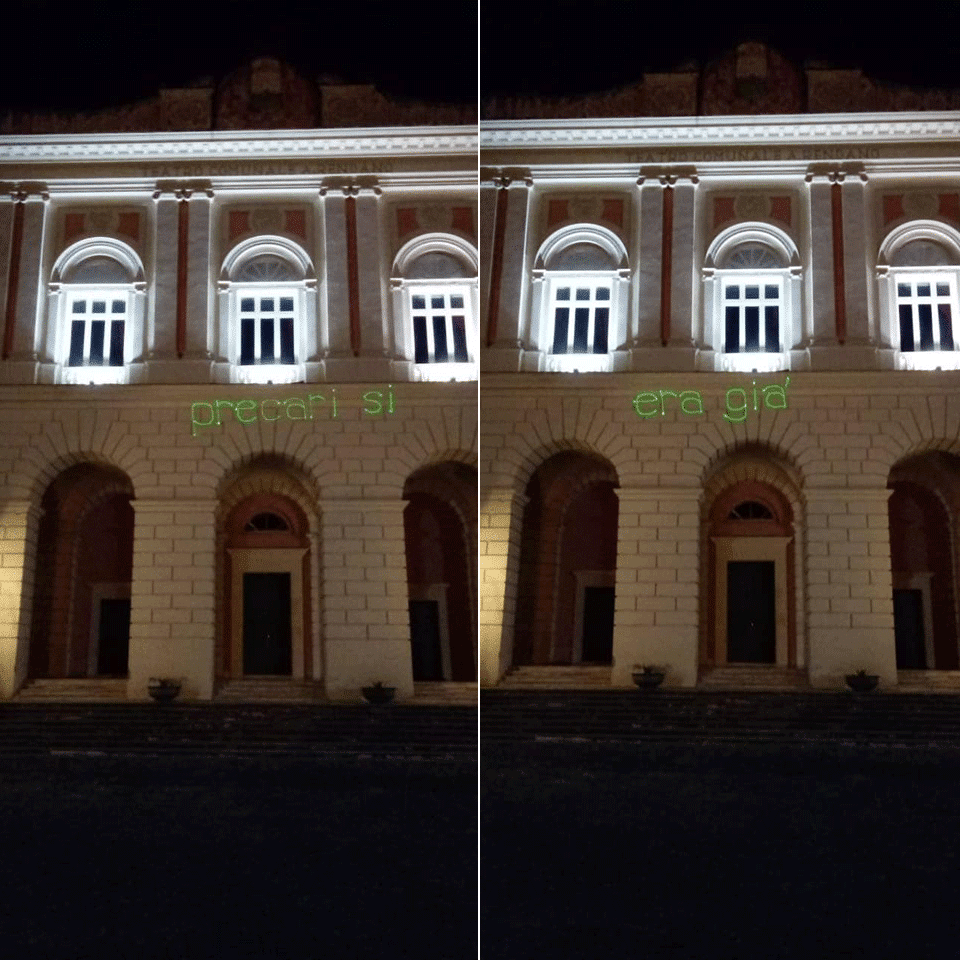 Si è trattato stavolta di un’azione simbolica, che ha visto la proiezione di frasi di lotta – ma anche di aforismi poetici – sulle facciate dei diversi teatri e degli spazi culturali, chiusi da più di un anno e, in molti casi, per quanto riguarda la città di Cosenza, già inattivi da molto più tempo.